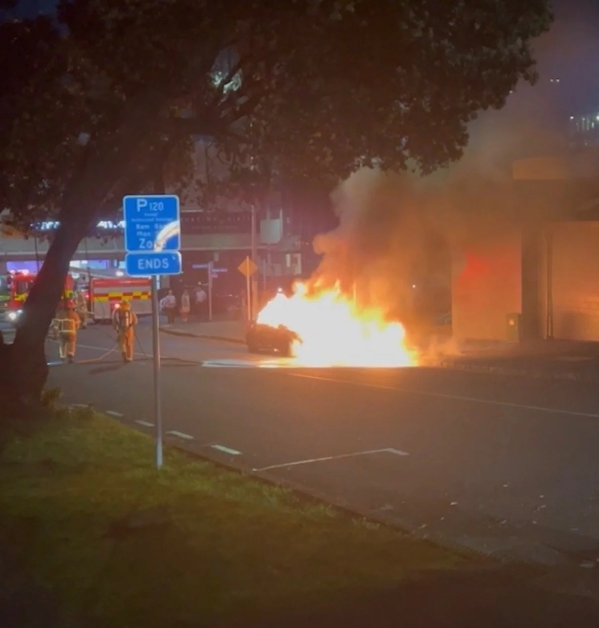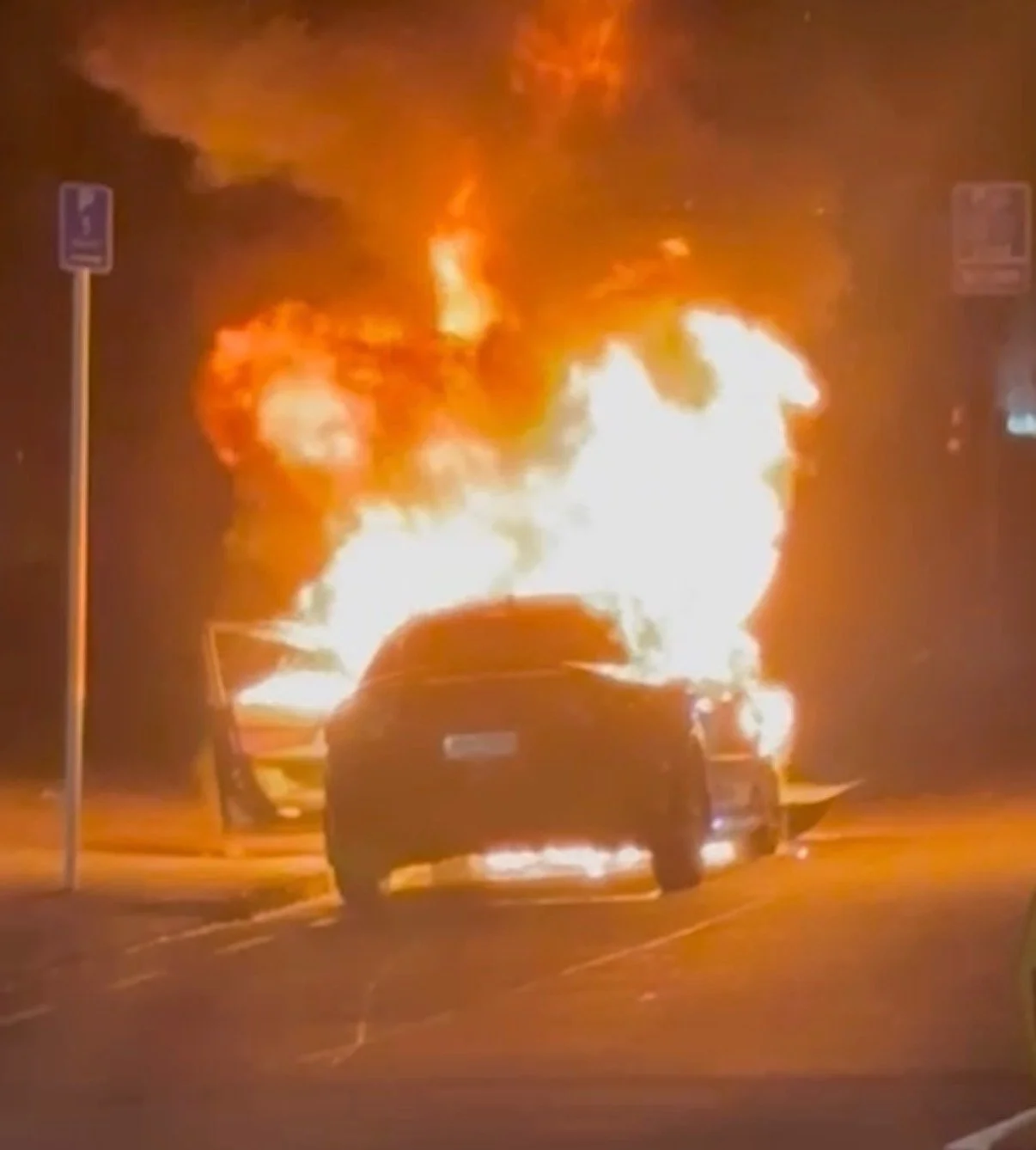 Video footage from witnesses shows the car parked in a five-minute bay, already consumed by fire before firefighters arrived. In another clip, the blazing vehicle can be seen rolling backwards down the road — flames shooting into the night — before it crashes into a fire truck.