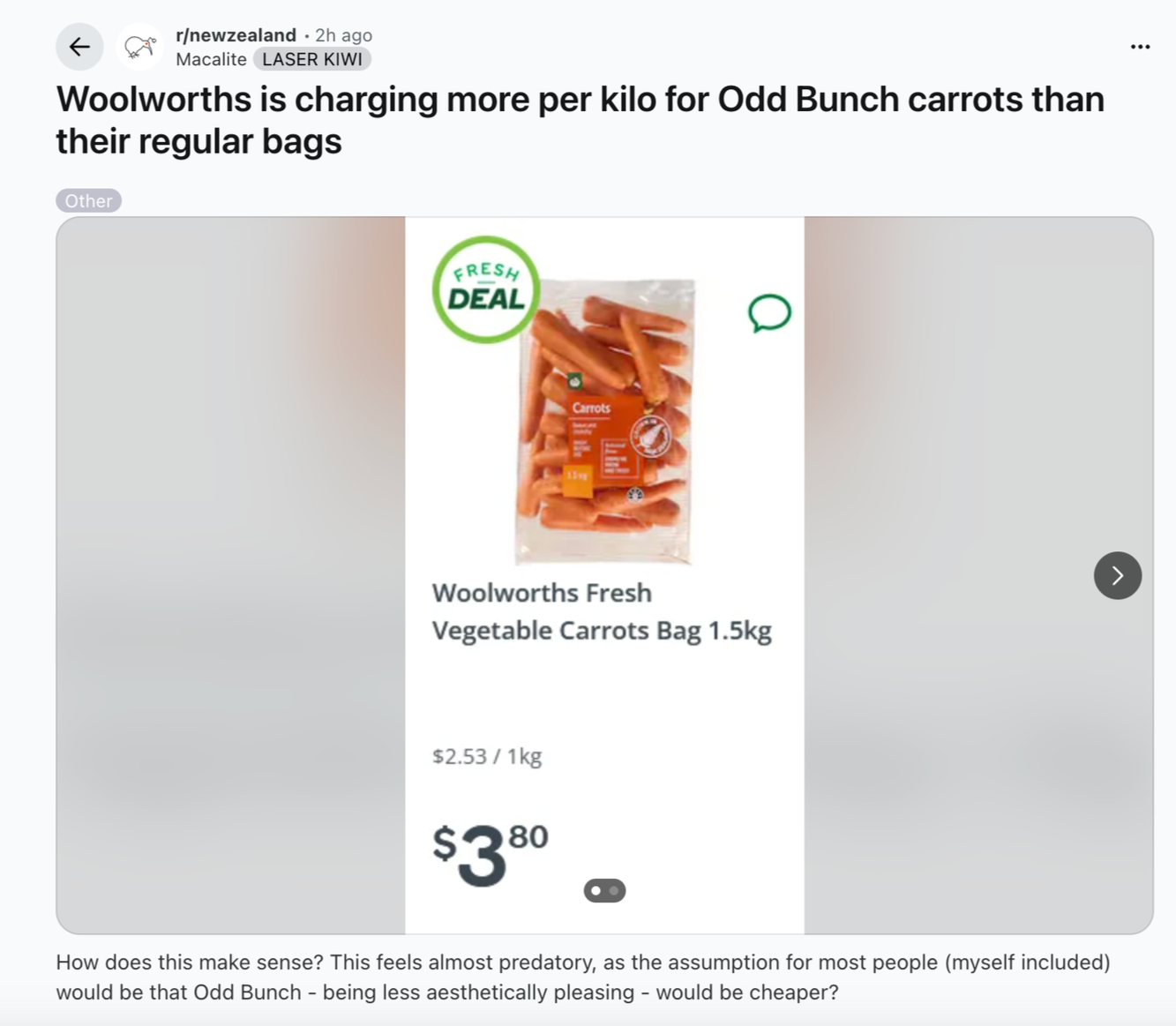 A recent post on the subreddit r/newzealand has sparked fresh frustration among Kiwi shoppers who say that the “odd bunch” carrots sold by Woolworths are more expensive than the regular variety.